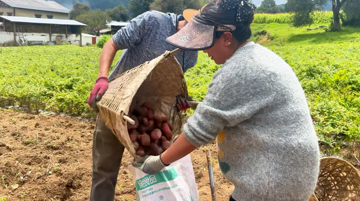 近日,香格里拉市小中甸镇的洋芋田里一片忙碌,迎来丰收季。广袤田野上,村民们手持镢头,弯着腰在地里忙碌。泥土翻涌,一颗颗饱满圆润的洋芋便露出“笑脸”。大家熟练地刨出洋芋,抖去泥土,分拣装袋,汗水浸湿衣衫,脸上却满是丰收的喜悦,田间地头洋溢着繁忙又欢喜的景象。(七林拉姆)