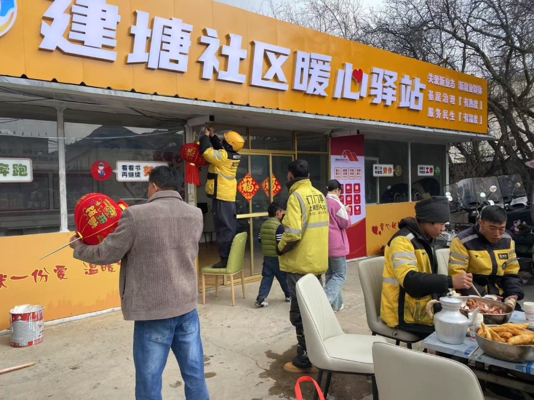 春节期间,当地组织在岗的外卖小哥在驿站贴春联、吃年夜饭