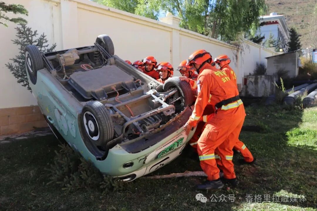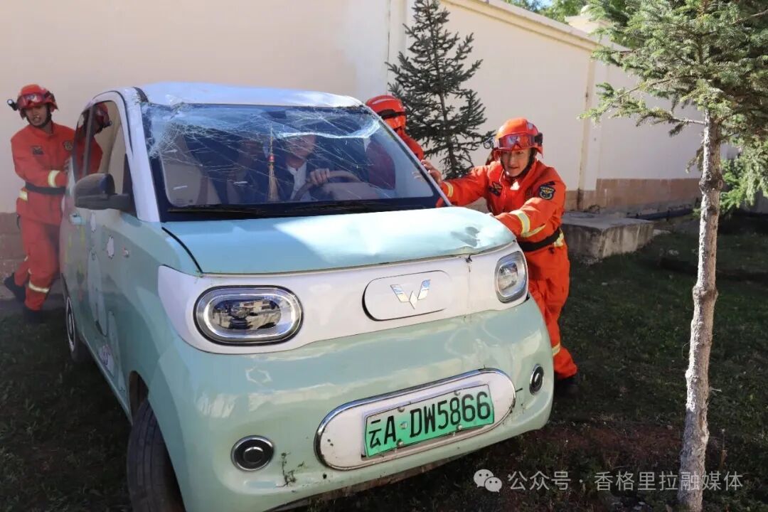 10月14日13时52分,香格里拉市昌都路发生一起交通事故。一辆新能源五菱mini车发生侧翻,车内两人被困。由于事故发生地点靠近迪庆州森林消防大队营区,这一情况被大队岗哨及时发现。