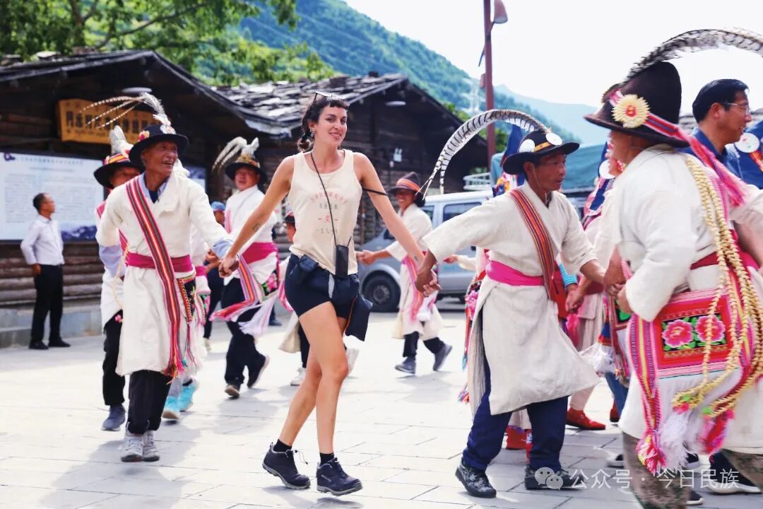 在维西县叶枝镇同乐傈僳族山寨,外国友人与村民同跳阿尺木刮 黄晓丽 摄