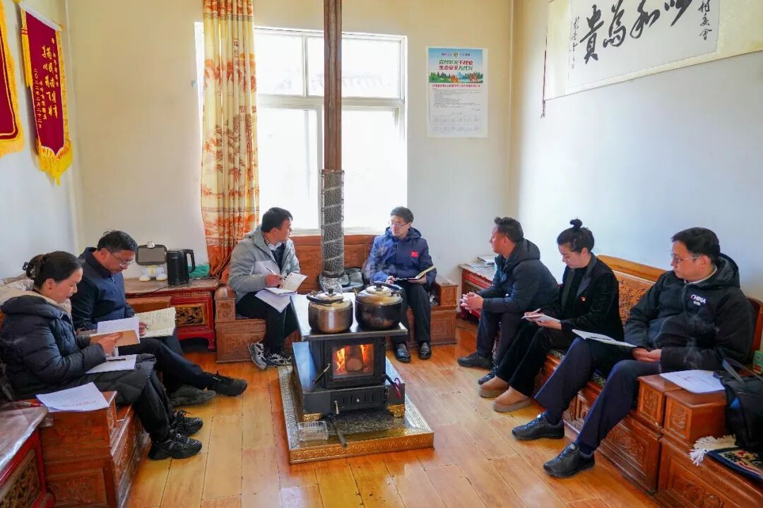 罗朝峰在和平村村委会,与小中甸镇党委书记、驻村工作队员等深入交流。