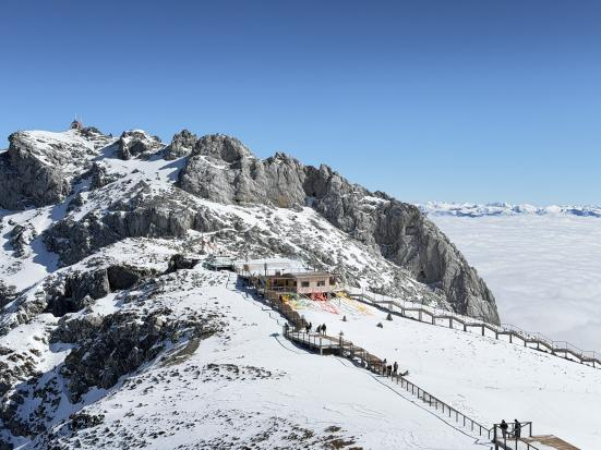 受冷空气与高原气候影响,石卡雪山山顶气温骤降,高海拔区域积雪明显。漫山松林覆雪,云雾缭绕山间,索道沿线一步一景,不少游客驻足拍摄,感受“三月飞雪”的浪漫与壮阔。
