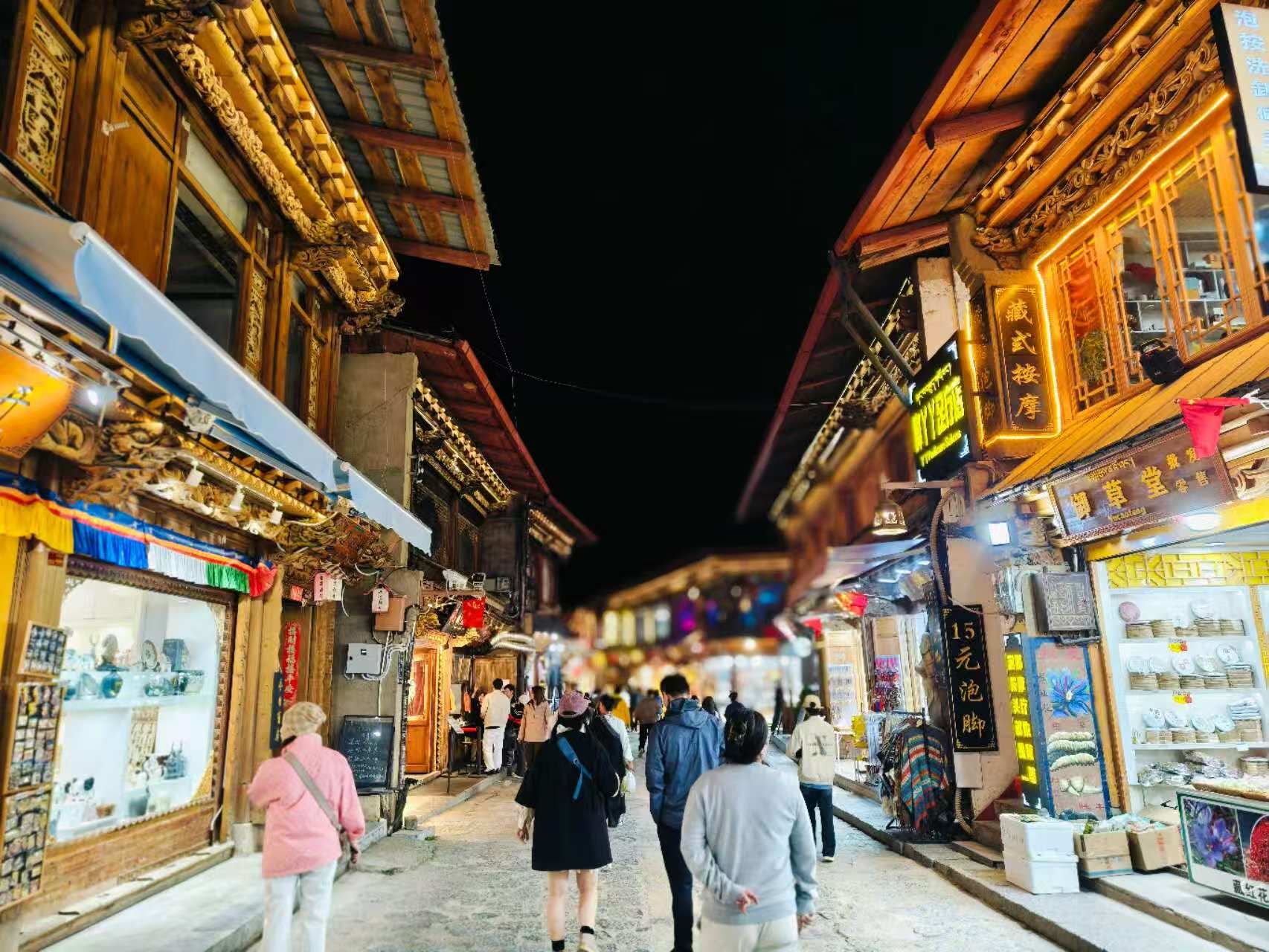 当万颗星子散播夜空,香格里拉独克宗古城广场上到处都是热闹欢腾的景象,来自世界各地的来客与身着民族服装的当地群众在远方隐绰的巨型转经筒下同唱一首歌、同跳一支舞,共同绘就民族团结同心圆。这座有着1300多年历史、民族文化与现代艺术交织的“月光之城”,正在逐步向夜间文化和旅游消费集聚区转变。