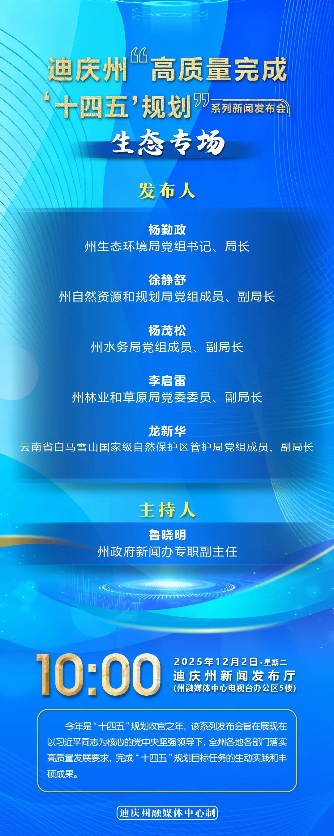 原标题:迪庆州“高质量完成‘十四五’规划”系列新闻发布会生态专场将于明天上午举行