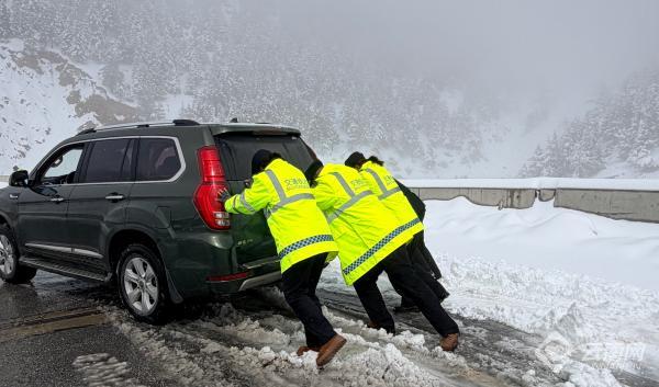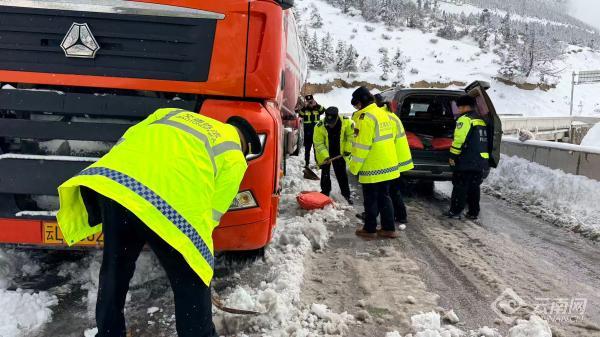 在紧张救援的同时,执法人员还主动为滞留司乘人员送上矿泉水、面包等应急物资,安抚焦虑情绪,对有特殊需求的群众提供一对一帮扶,让春雪中的道路充满温情。